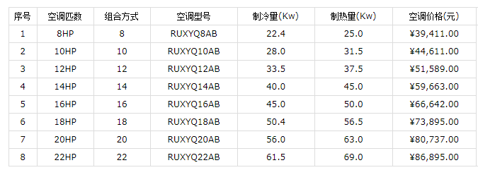 1、VRV X系列單模塊室外機價格表