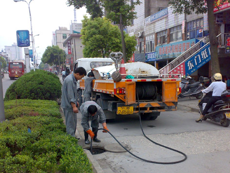 這是一種廣泛應用的管道清淤法。主要是用1 臺高壓噴發(fā)車,配備有大型水罐、機動卷管器、高壓水泵、射水噴頭號。操作時由汽車引擎驅動高壓泵,將水加壓后送入射水噴咀?可渌l(fā)生的反效果力,使射水噴頭和膠管一同向相反方向行進,一同也清洗管道壁。當噴頭抵達必定的間隔時,機動絞車將軟管卷回,此刻射水噴頭繼續(xù)噴發(fā)水流,將管道內殘留的沉積物沖到下賤檢查井。然后由吸泥車將其吸走。這種方法適用各種口徑的下水管道,但由于用水需求干清水,所以成本比較高,為了降低成本,現在的清淤車大多備污水凈化設備,以使用下水道中的污水。