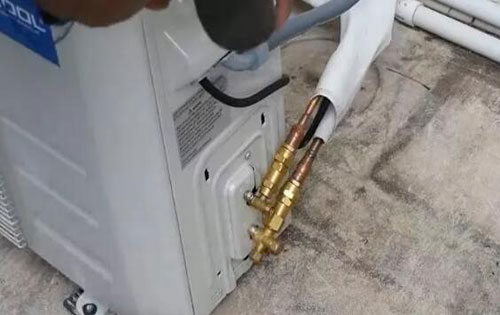 七,把空調(diào)連接好,主要是把內(nèi)外機(jī)連接管都緊好,注意一定接好,以防制冷劑泄漏。