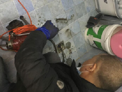 6.靠近角筏接一條足以通到堵點的軟管,把軟管放進地漏至塞不進去,然后用毛巾盡量堵住地漏口,而后開完角筏水量,同時用力壓住地漏口毛巾盡量不讓水往外返。反復一至二次能通則通,不通及止。